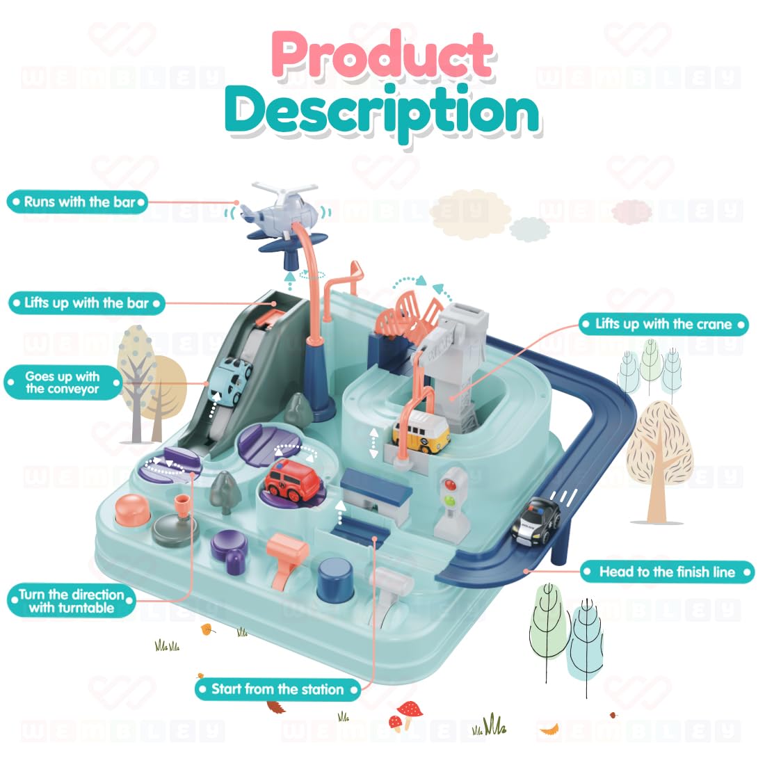 Rev up the fun with the Car Adventure Track Set. This 20-piece playset comes with a track, crane, 4 cartoon cars, a helicopter, and 6 mechanical switches that control ramps, bridges, and turntables. No batteries needed - kids power the action by lifting, turning, and guiding cars through thrilling obstacles. Packed with adventure and learning, it helps build focus, problem-solving, coordination, and fine motor skills while keeping little ones entertained for hours.