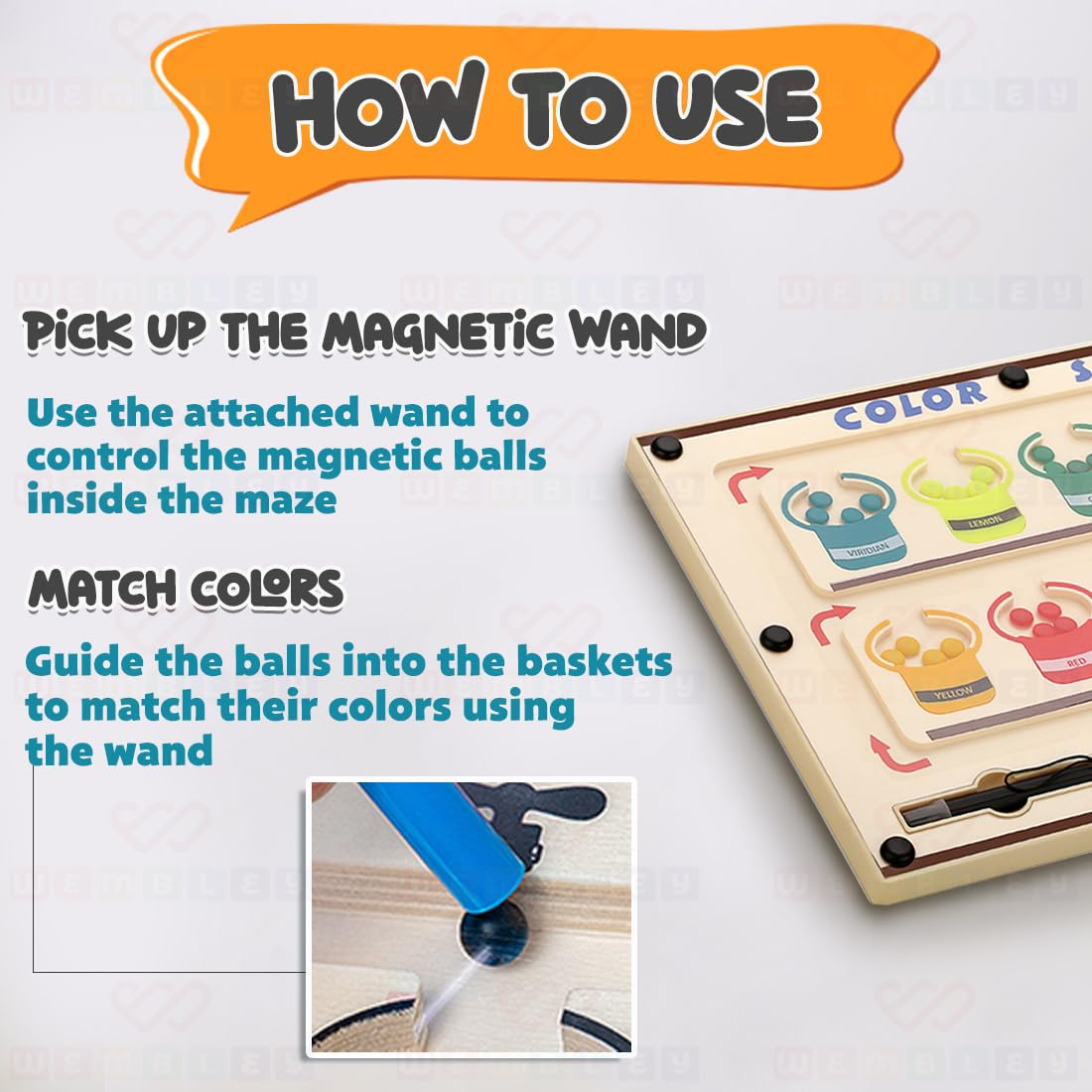 Embark on a colorful learning adventure. With this magnetic maze, preschoolers can turn playtime into a game of discovery. Using the magical wand, kids guide bright, bouncing balls into their matching baskets, learning colors while having a blast. A perfect way to spark curiosity, keep little hands busy, and make every moment of play joyful and exciting.