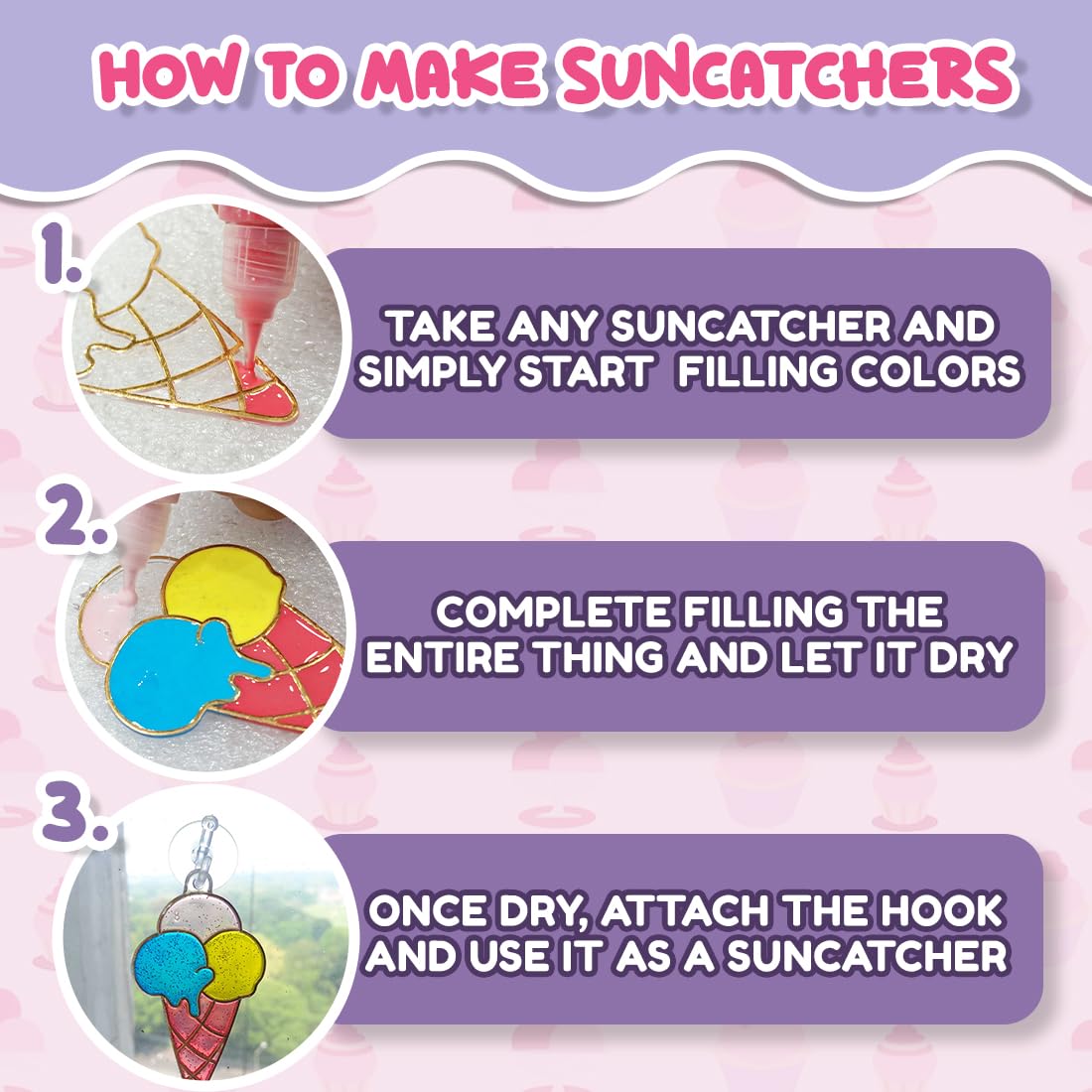 - Comes with 6 suncatchers, a design book, 6 bright colors, and 6 suction cups with hooks